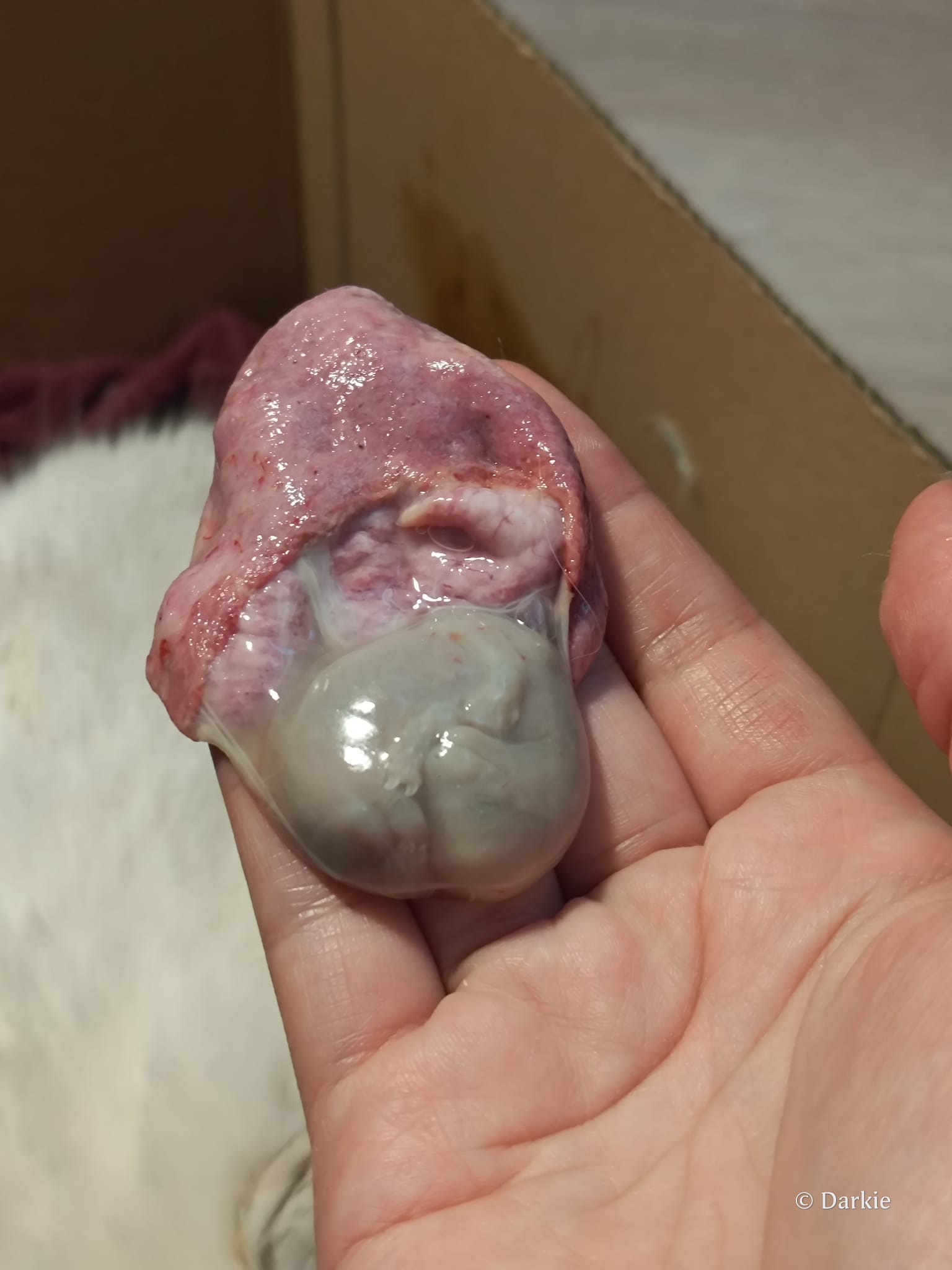 I hadn't taken her to ultrasound or xray to see how many kittens were inside, in hindsight it would've been nice to have a bit of knowledge before she started - she had 12 fetuses attached to her uterus, TWELVE! One of these had passed away a bit before birthing and was stillborn, another fetus had aborted at around 40 days of gestation. The fetus had distinctive features - legs and overall it's build was that of a cat, some bones had formed already but it's placenta was completely pale and leather-like, it felt like it was dry. I believe the placenta had deattached for one reason or another and it had then stopped developing. For those interested I have uploaded photos of the aborted fetus purely for educational purposes, VIEWER DISCRETION IS ADVICED, photo 1, photo 2.